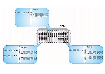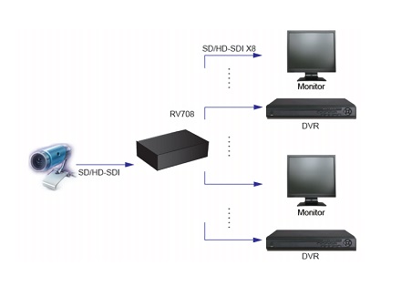 RV708是一款SDI 1进8出分配器,可将1路SD-SDI/HD-SDI视频信号无失真、无延时分配成8路,分别输出到SDI设备上。RV708分为台式设备和插卡式设备,台式设备RV708S采用体积小巧的台式机设计;插卡式设备采用标准19英寸,4U插箱设计,可插入8张分配器插卡RV708K。